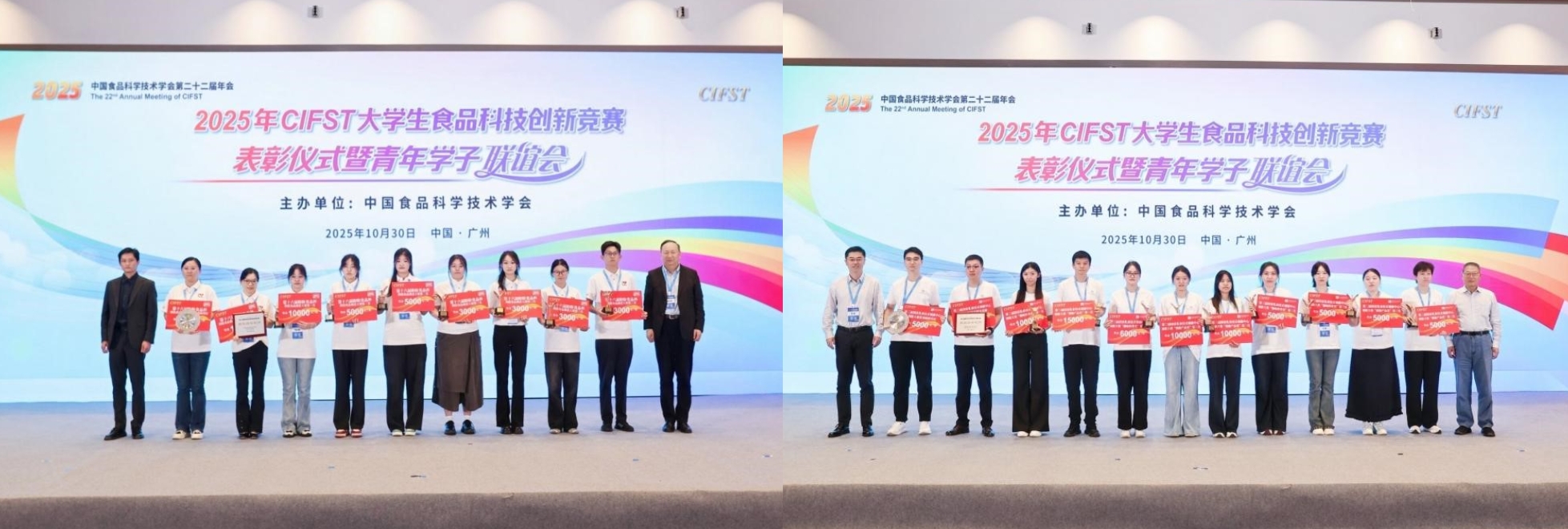 近日,中国食品科学技术学会(CIFST)第二十二届年会在广州召开,期间举行了2025年大学生食品科技创新竞赛颁奖仪式。我院师生在本年度赛事中斩获2项佳绩,并受学会邀请出席活动。
