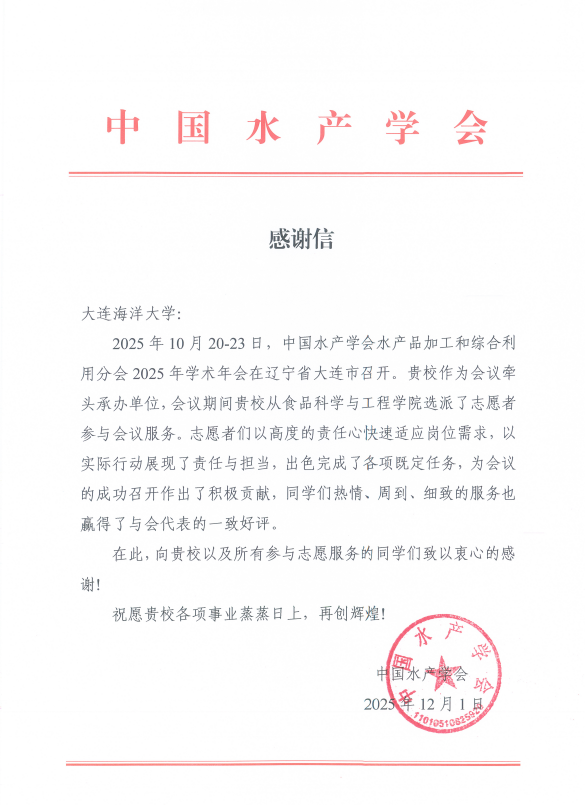 1020-23日,我校作为牵头单位,承办了中国水产学会水产品加工和综合利用分会2025年学术年会。近日,中国水产学会向我校发来感谢信,对我院选派出的志愿者给予了高度评价。信中指出,志愿者们以实际行动展现出了青年责任与担当,为会议的成功召开作出了积极贡献。