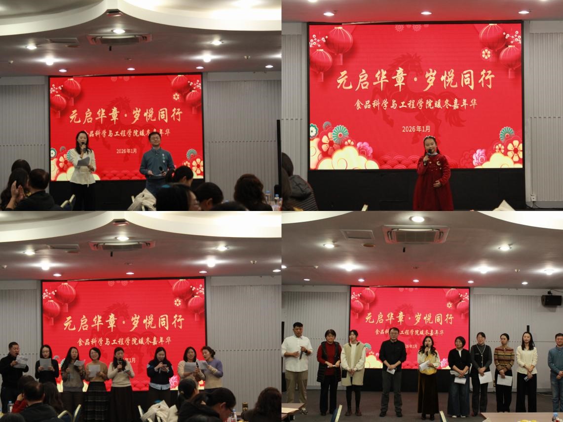 活动在欢乐温馨的氛围中展开。现场设置了“西红柿争夺战”“抢水瓶”“心有灵犀”“橘球挑战”等紧张有趣的互动游戏,教师们积极投入、默契配合,现场笑声连连、气氛热烈。游戏间隙,祁艳霞老师女儿以一首童真清澈的《苹果香》带来温馨感动,食品质量与安全系的教师们献上了经典歌曲《明天会更好》,食品科学与工程系的教师们则用一曲深情的《万事如意》表达了对新年的美好祝愿。